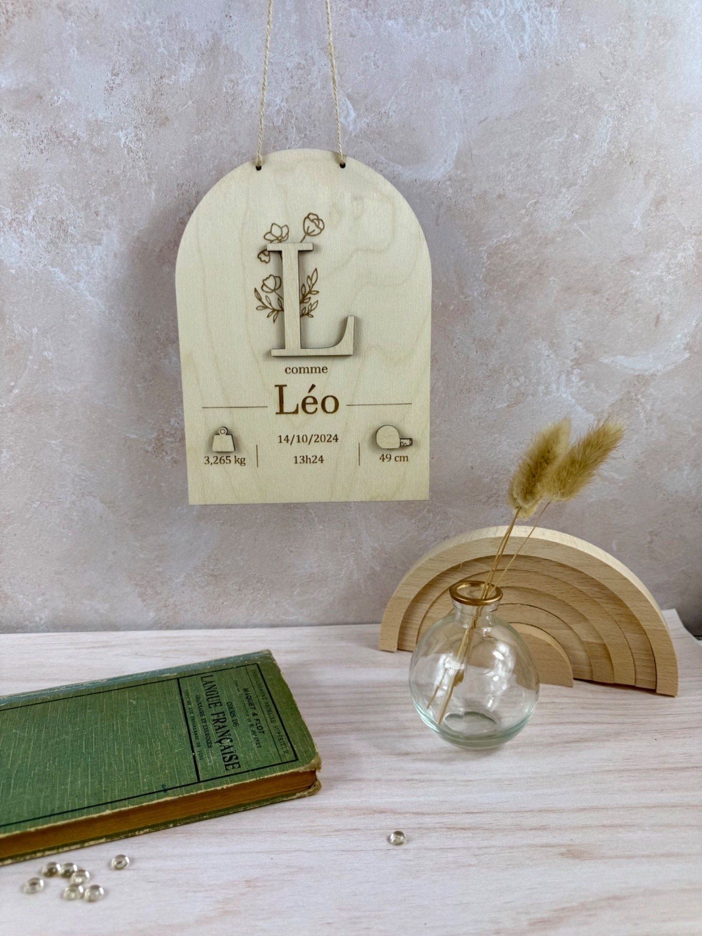 Pancarte en bois gravée et découpée, prête à être suspendue dans la chambre de l'enfant avec les petits détails de sa naissance.